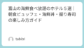 朝食ビュッフェの海鮮丼コーナーや、海の幸を使った実演メニューなど、ホテルの中で“食べ放題気分”を味わえる食事がある宿を中心にまとめました(内容は季節・仕入れ状況により変わる場合があります)。